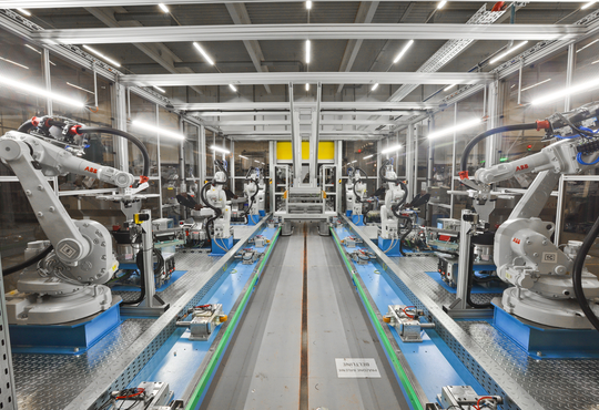 Für noch mehr Effizienz befinden sich jeweils zwei Türtafeln in einem Alugestell auf einem selbstfahrenden Ladungsträger, der sie an den links und rechts platzierten Robotern vorbeitransportiert. Beim Weg in diesen Montagetunnel erfolgt über einen Magnetstopp und Barcodescanner die Abfrage, um welche Türvariante es sich handelt und welche Ausstattung sie haben soll.